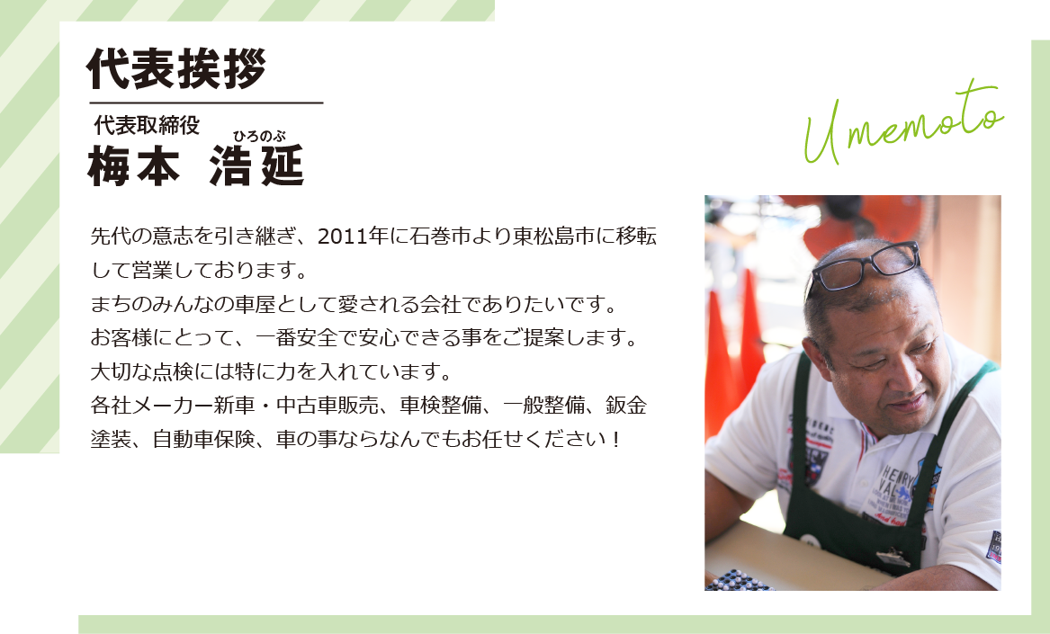 | 昭和54年10月 | 宮城県石巻市門脇字明神23番地の2に梅本自動車工業を開設し、同時に仙台陸運局長に普通・小型・分解整備事業の認証を申請し受理される。 認証番号 仙陸認 3-6545号 認証年月日 昭和 54年10月4日付 対象自動車 普通自動車(中型)、普通自動車(小型)、普通自動車(乗用)、小型四輪自動車、小型三輪自動車、小型二輪自動車、軽自動車 |