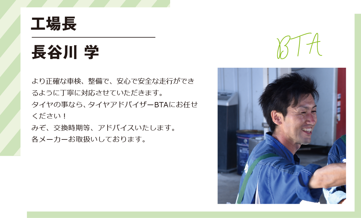 より正確な車検、整備で、安心で安全な走行ができるように丁寧に対応させていただきます。タイヤの事なら、タイヤアドバイザーBTAにお任せください!みぞ、交換時期等、アドバイスいたします。各メーカーお取り扱いしております。 自慢のチームワーク! 毎日楽しく、信念をもって仕事に取り組んでいます! 丁寧に仕上げます!笑顔で接客を心がけてます! いつでも笑顔で親切丁寧にご対応いたします! どんな相談もお聞かせください。全力でお答えします! はじめまして!どうぞ宜しくお願いいたします!